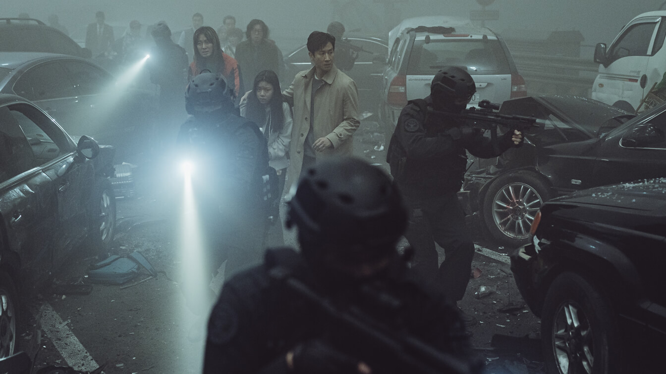 주인공 차정원은 야망 넘치는 캐릭터로 청와대 국가안보실장이자 유력한 차기대선후보인 정현백을 지지하는 인물이다. 정원은 영화 초반부에 정치적 이익을 위해 비윤리적 선택을 서슴지 않는 계산적이고 이기적인 면모를 보여주고, 정현백은 그런 정원에게 딸 경민을 위해 쓰라며 유학비를 건네준다. 정원은 경민의 유학길 배웅을 위해 인천공항으로 향하던 중 공항 대교의 짙은 안개로 인해 연쇄 추돌사고에 휘말린다. 같은 시각, 공항대교 위에는 일명 "프로젝트 사일런스"의 군사용 실험견들이 극비리에 이송 중이었고, 사고로 인해 실험견들이 모두 차량 밖으로 나와 통제불능 상태가 된다. 통제불능이 된 실험견들은 공항대교 위에 있던 모든 생존자를 타깃으로 인식하고 보이지 않는 안갯속에서 공격을 시작한다.
